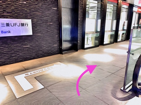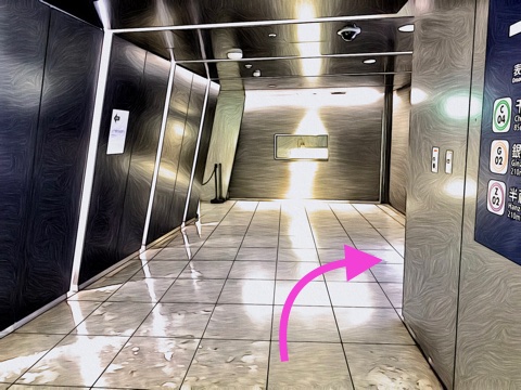 エレベーターを降り前方の改札を出て右へ