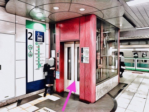 出入口2のエレベーターで改札階へ