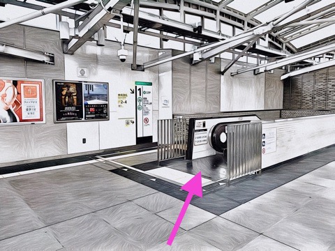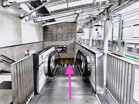3両編成:2号車1番扉(先頭から2両目)、10両編成:9号車1番扉(先頭から2両目)付近からエスカレーターへ