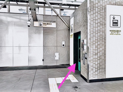 3両編成:3号車3番扉(先頭から1両目)、10両編成:10号車3番扉(先頭から1両目)付近からエレベーターへ