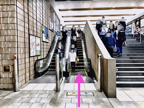 8両編成:5号車1番扉(先頭から5両目)、10両編成:5号車1番扉(先頭から5両目)付近のエレベーターで改札階へ