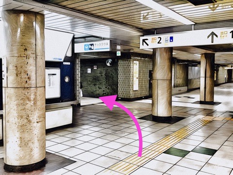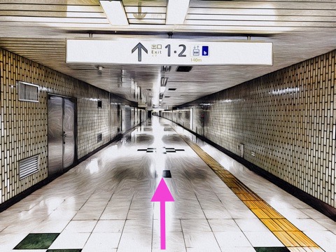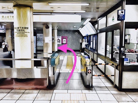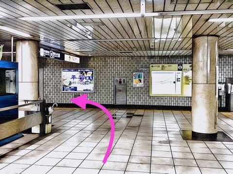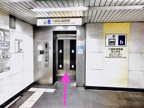 8両編成:6号車2番扉(先頭から3両目)、10両編成:6号車2番扉(先頭から5両目)付近のエレベーターで改札階へ
