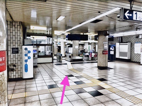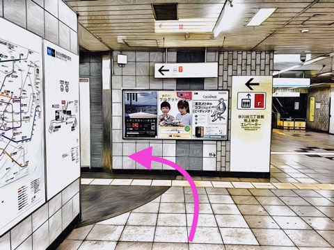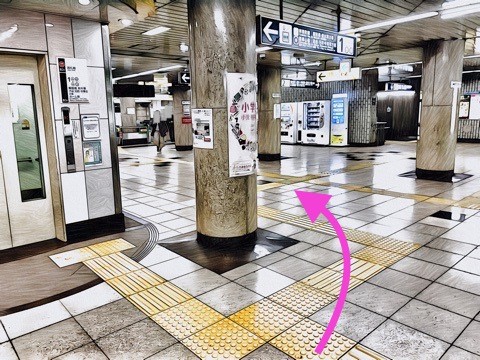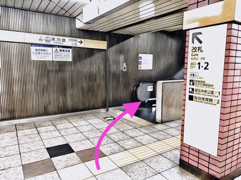 8両編成:2号車4番扉(先頭から7両目)、10両編成:4号車4番扉(先頭から7両目)付近のエスカレーターで改札階へ