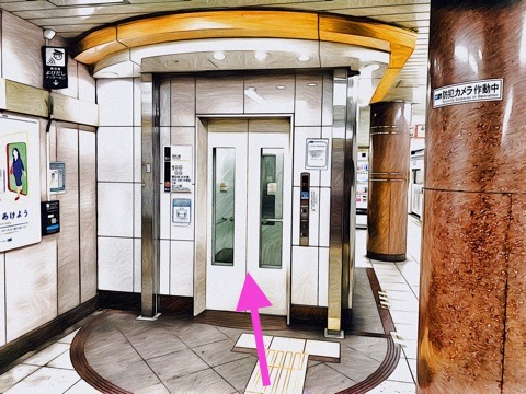8両編成:3号車3番扉(先頭から6両目)、10両編成:5号車3番扉(先頭から6両目)付近のエレベーターで改札階へ