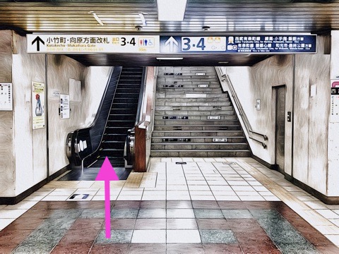 エスカレーターを降り前方の改札へ