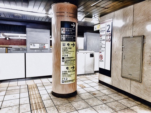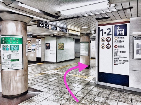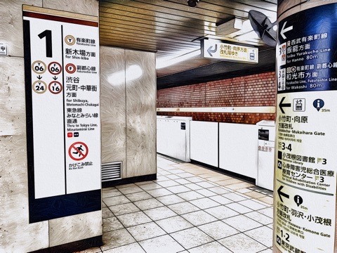 1、2番線ともに新木場方面行きホーム(8両編成:8号車3番扉/先頭から1両目、10両編成:9号車3番扉/先頭から2両目) ※ただし有楽町線 新木場方面行きもあり