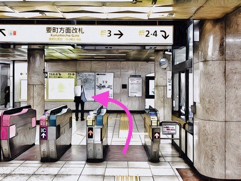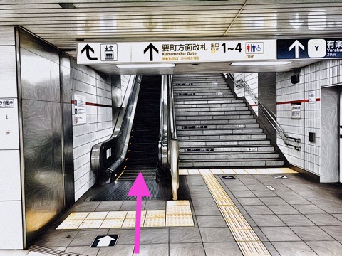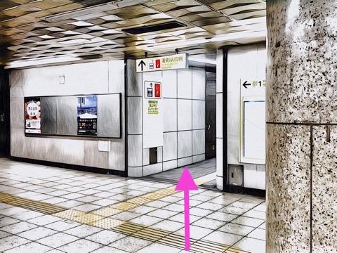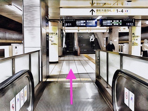 8両編成:8号車1番扉(先頭から1両目)、10両編成:8号車1番扉(先頭から3両目)付近のエスカレーターで上の階へ