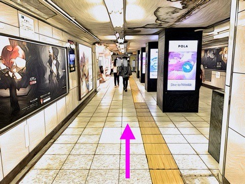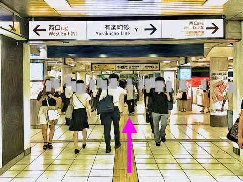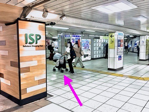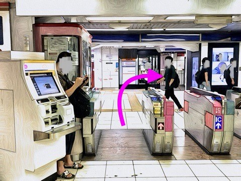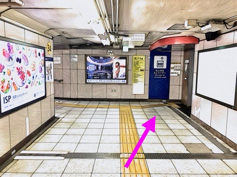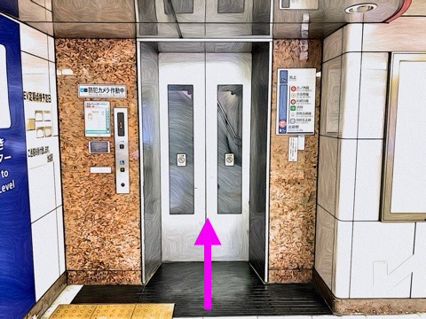 8両編成:6号車4番扉(先頭から6両目)、10両編成:8号車4番扉(先頭から8両目)付近のエレベーターで上の階へ