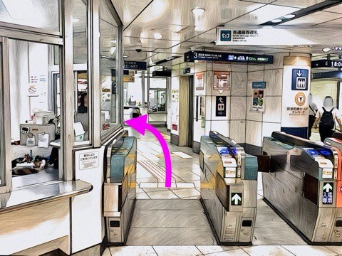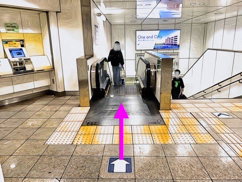 8両編成:7号車1番扉(先頭から7両目)、10両編成:9号車1番扉(先頭から9両目)付近のエスカレーターへ