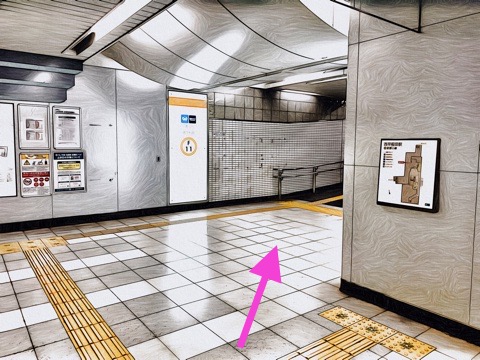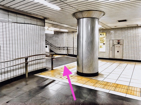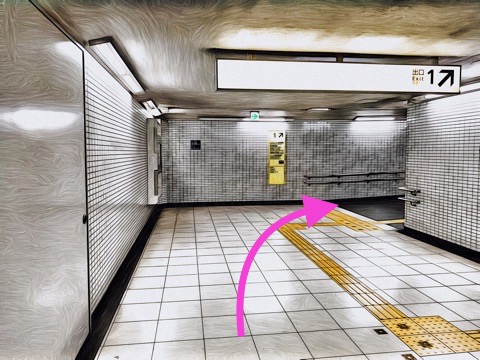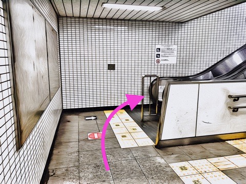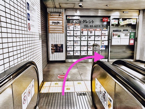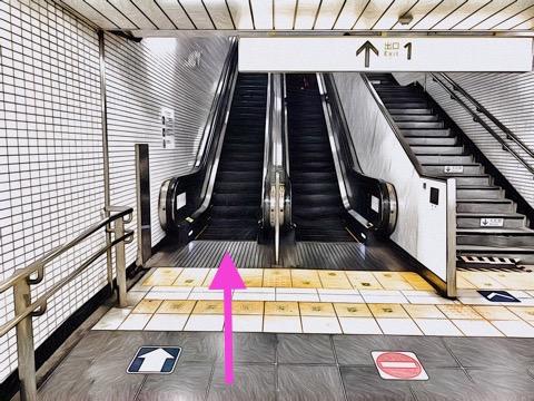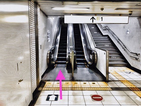 8両編成:1号車1番扉(先頭から8両目)、10両編成:1号車1番扉(先頭から10両目)付近のエスカレーターで改札階へ