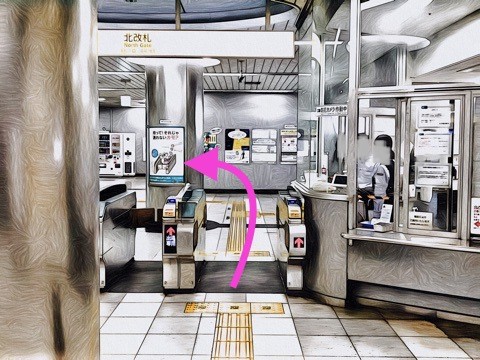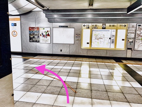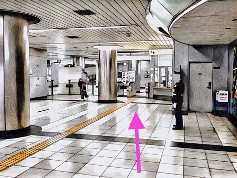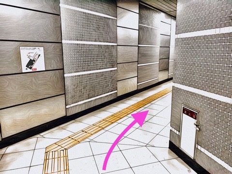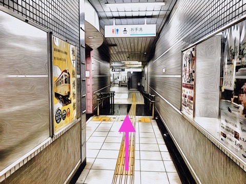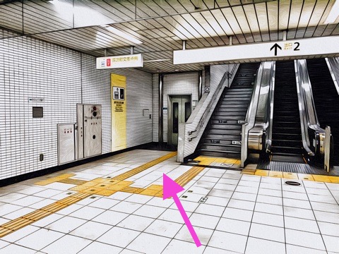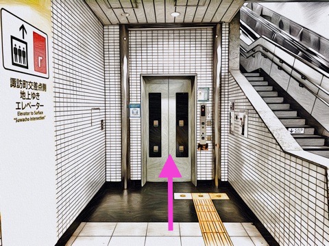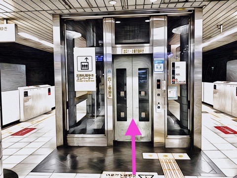 8両編成:1号車3番扉(先頭から1両目)、10両編成:1号車3番扉(先頭から1両目)付近のエレベーターで改札階へ