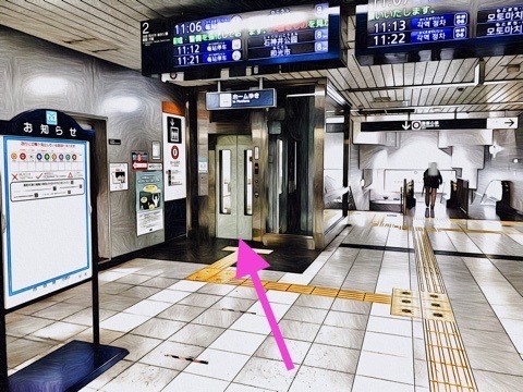 エレベーター出入口のエレベーターで改札階へ