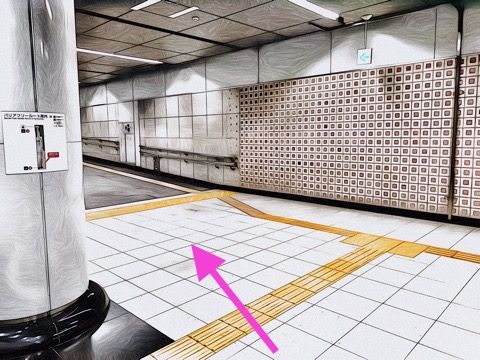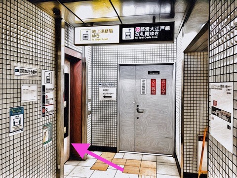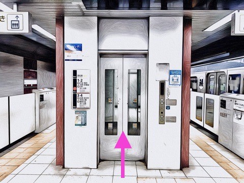 8両編成:4号車4番扉(先頭から5両目)、10両編成:6号車4番扉(先頭から5両目)付近のエレベーターで改札階へ
