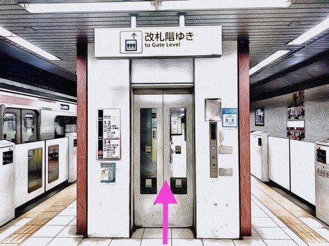 8両編成:6号車4番扉(先頭から6両目)、10両編成:6号車4番扉(先頭から6両目)付近のエレベーターで改札階へ