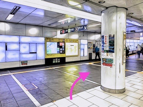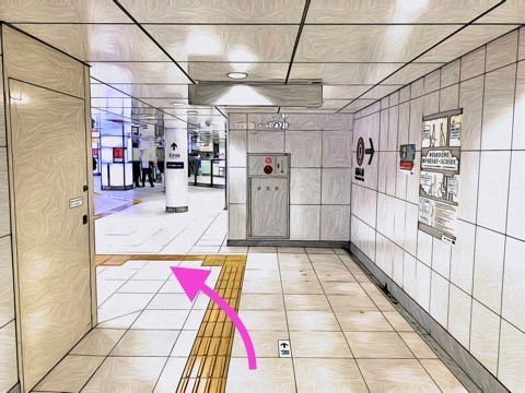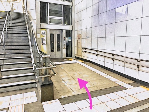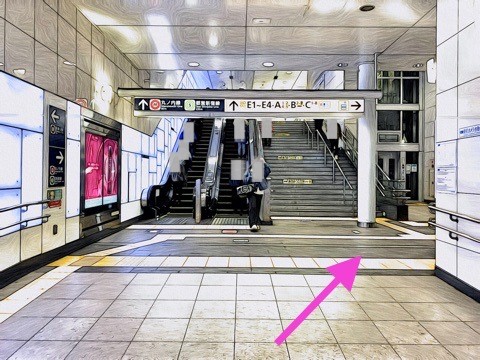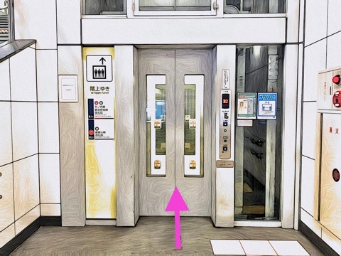 8両編成:3号車2番扉(先頭から6両目)、10両編成:5号車2番扉(先頭から6両目) 付近のエレベーターで改札階へ