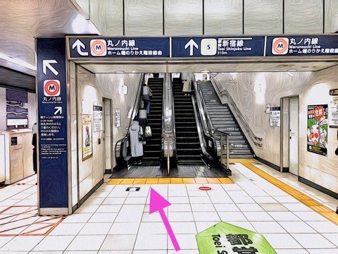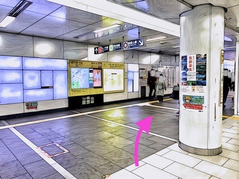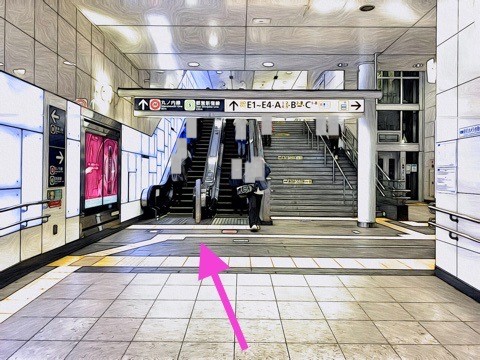 8両編成:3号車2番扉(先頭から6両目)、10両編成:5号車2番扉(先頭から6両目) 付近のエスカレーターへ