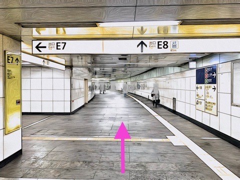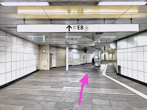 8両編成:8号車4番扉(先頭から1両目)、10両編成:10号車4番扉(先頭から1両目) 付近のエスカレーターへ