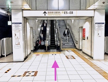 8両編成:8号車4番扉(先頭から1両目)、10両編成:10号車4番扉(先頭から1両目) 付近のエスカレーターへ