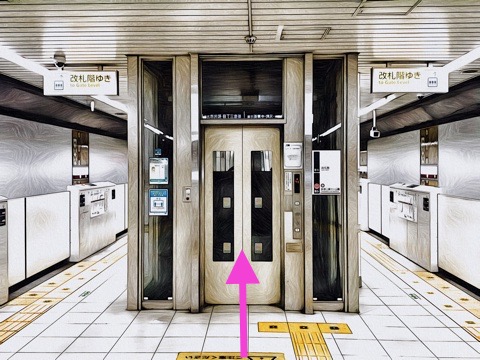 8両編成:7号車1番扉(先頭から7両目)、10両編成:8号車1番扉(先頭から8両目)付近のエレベーターで改札階へ