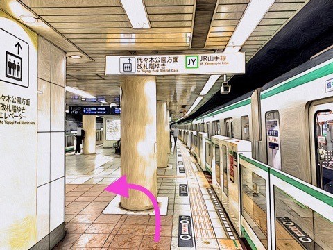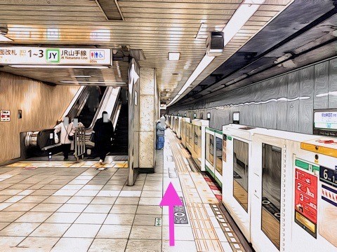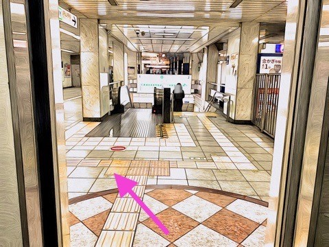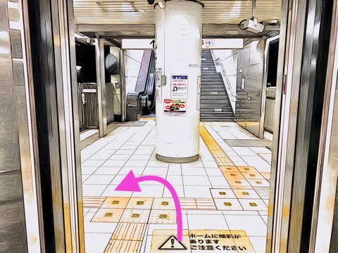 8両編成:5号車4番扉(先頭から4両目)、10両編成:6号車4番扉(先頭から5両目)付近のエレベーターで上の階へ