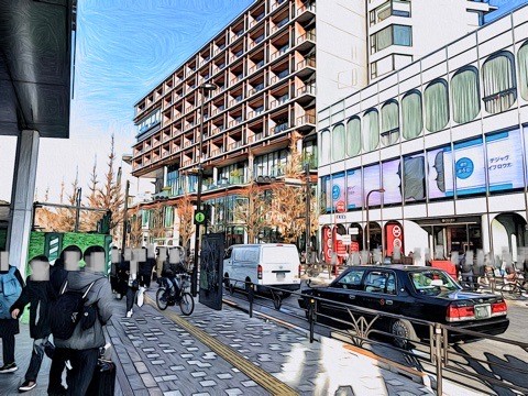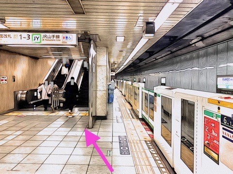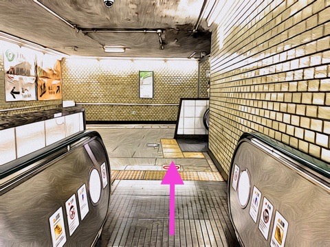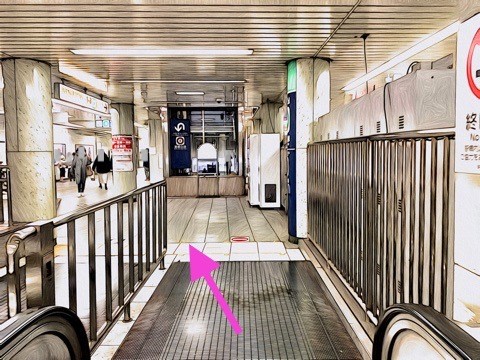8両編成:3号車3番扉(先頭から6両目)、10両編成:4号車3番扉(先頭から7両目)付近のエスカレーターへ