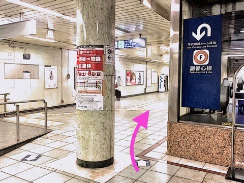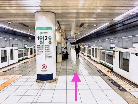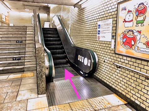 前方のエスカレーターで東京メトロ千代田線ホーム階へ