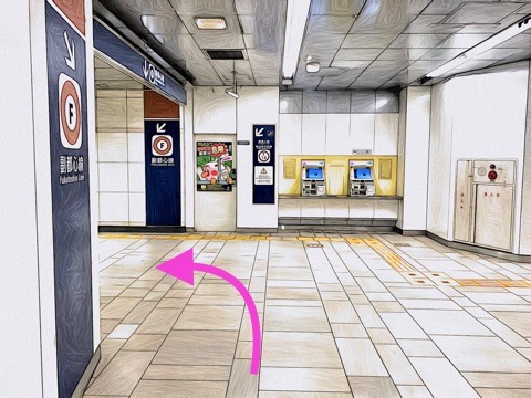 エスカレーターで東京メトロ千代田線ホーム階へ