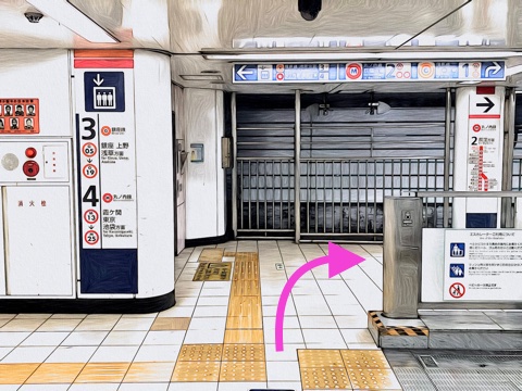 1号車1番扉(先頭から6両目)付近からエスカレーターへ