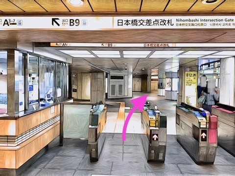6号車3番扉(先頭から6両目)付近からエレベーターへ