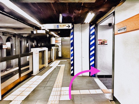 3号車1番扉(先頭から3両目)付近から階段昇降機へ