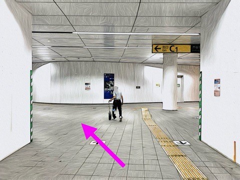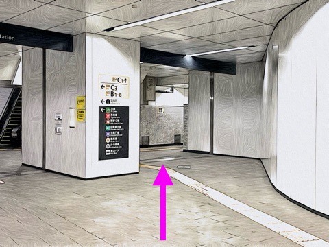 1号車4番扉(先頭から10両目)付近のエレベーターで下の階(B4F)へ