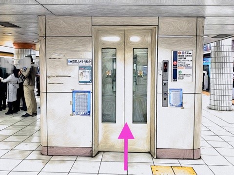 6号車3番扉(先頭から6両目)付近のエレベーターで改札階へ