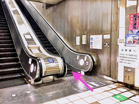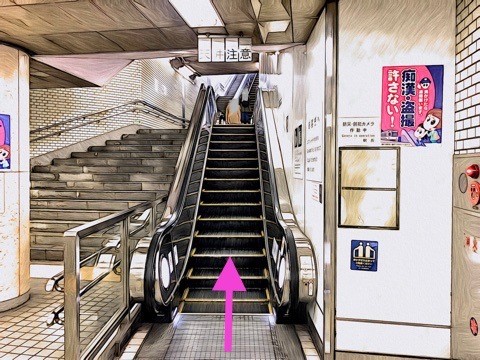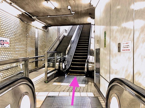 エスカレーターを降り前方のエスカレーターで地上へ