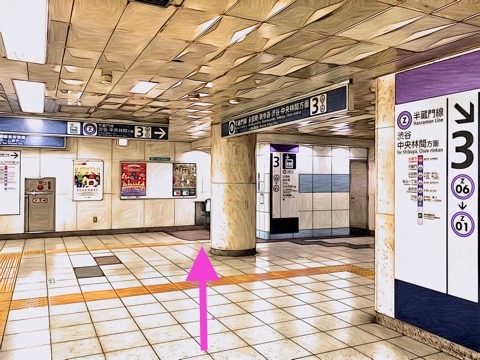 3番線が渋谷方面行きホーム(1号車1番扉/先頭から10両目)