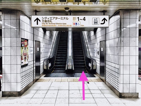 3号車2番扉(先頭から8両目)付近のエスカレーターで改札階へ