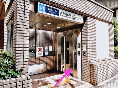 出入口4の右にあるエレベーターへ
