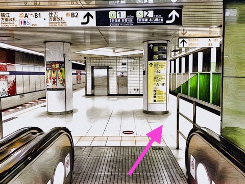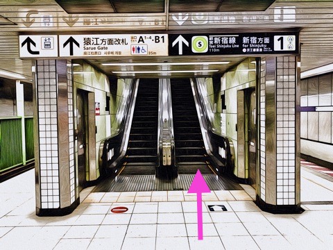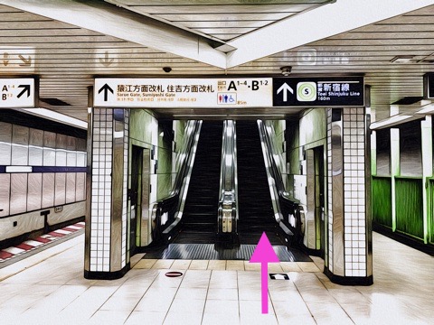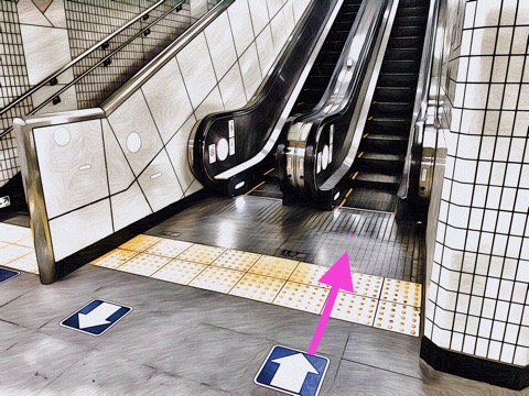6号車1番扉(先頭から6両目)付近のエスカレーターで上の階へ