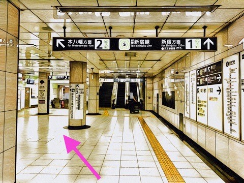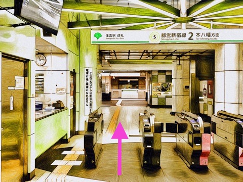 左前方の都営新宿線改札へ