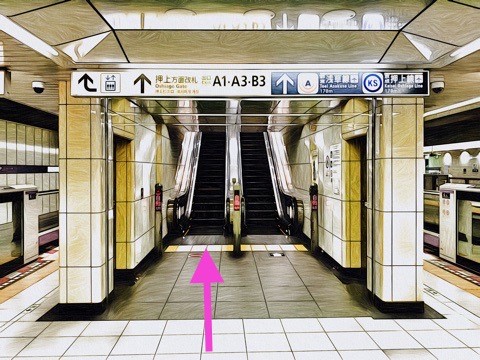 6号車4番扉(先頭から6両目)付近のエスカレーターで改札階へ