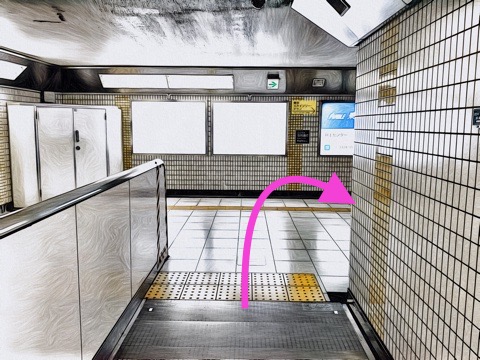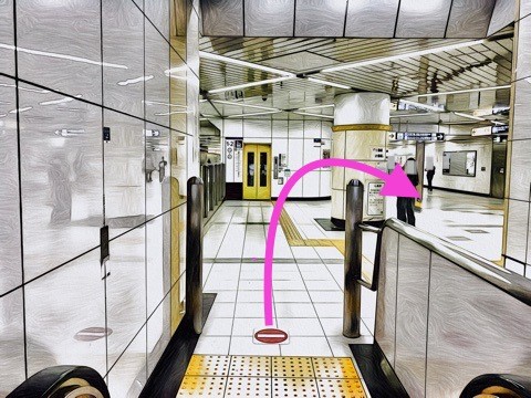 2号車4番扉(先頭から2両目)付近のエスカレーターで改札階へ