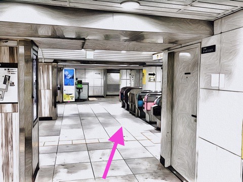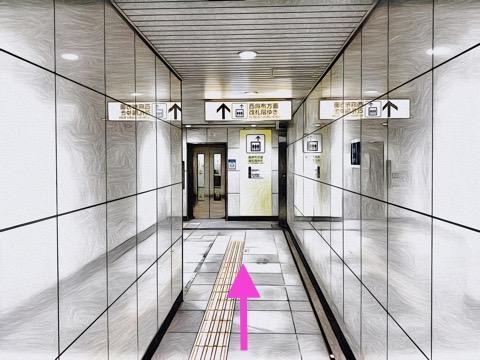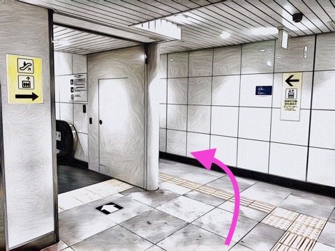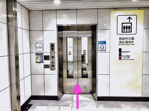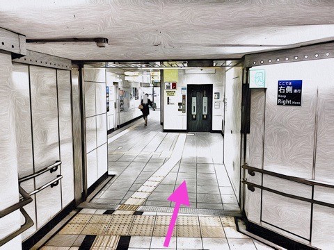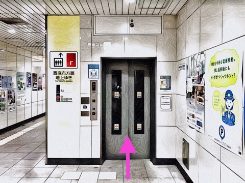 1号車1番扉(先頭から7両目)付近からエレベーターへ