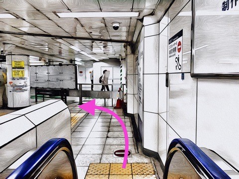 6号車3番扉(先頭から6両目)付近のエスカレーターへ