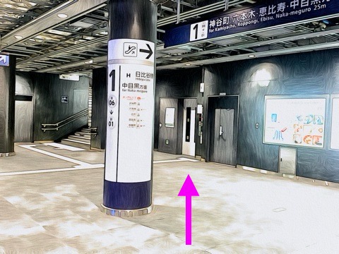 1番線が中目黒方面行きホーム(4号車2番扉/先頭から4両目)