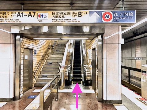 2号車3番扉(先頭から6両目)付近のエスカレーターへ