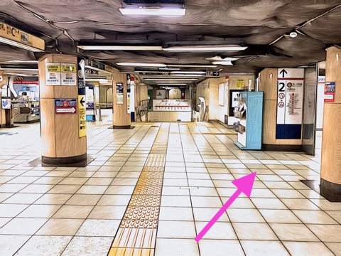 2号車2番扉(先頭から2両目)付近のエスカレーターへ