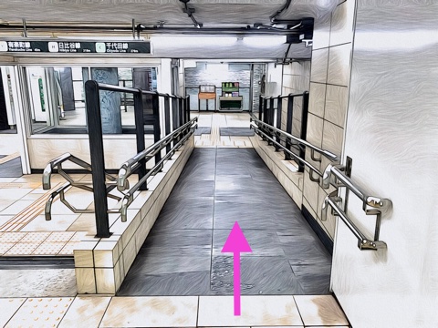 自動ドアを出て前方にあるスロープへ