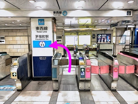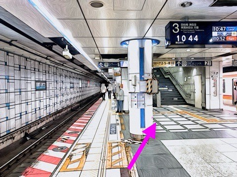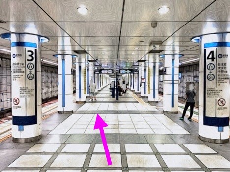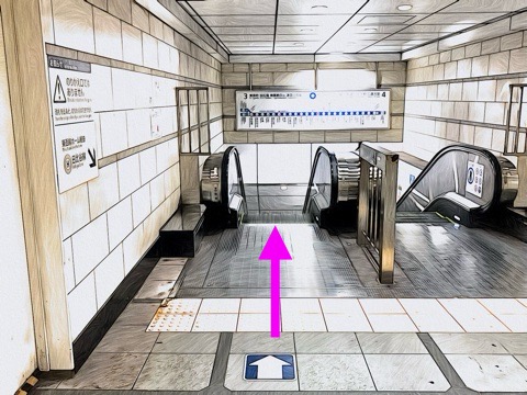 3号車2番扉(先頭から3両目)付近のエスカレーターで日比谷線北千住方面行きホーム階へ
