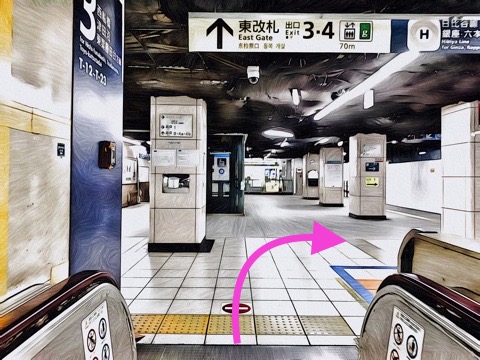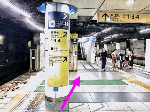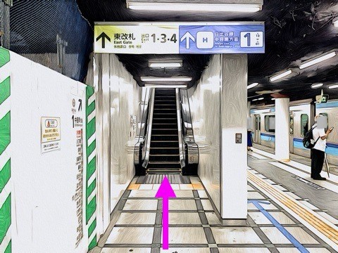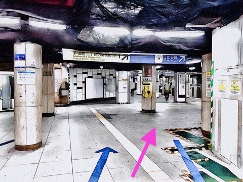 1番線が中目黒方面行きホーム(1号車1番扉/先頭から7両目)
