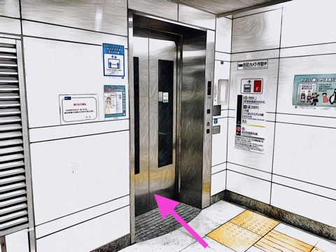 2号車2番扉(先頭から2両目)付近のエレベーターへ