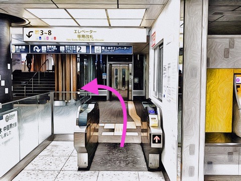 4号車4番扉(先頭から4両目)付近のエレベーターで改札階へ